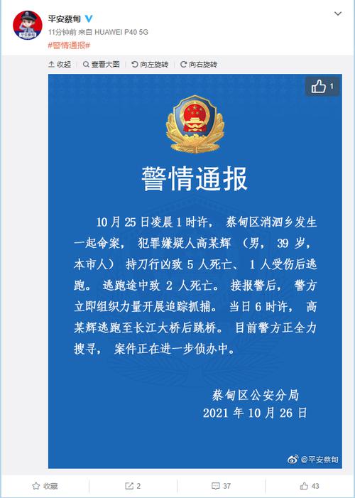 10月25日凌晨1时许,蔡甸区消泗乡发生一起命案,犯罪嫌疑人高某辉(男,39岁,本市人)持刀行凶致5人死亡、1人受伤后逃跑。逃跑途中致2人死亡。接报警后,警方立即组织力量开展追踪抓捕。当日6时许,高某辉逃跑至长江大桥后跳桥。目前警方正全力搜寻,案件正在进一步侦办中。