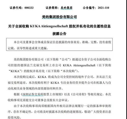 库卡称,鉴于美的集团完全支持库卡的长期增长计划,并基于对美的承诺的全面评估,管理委员会和监事会决定库卡不再需要公开上市,因为2016年美的收购后,库卡已经停止通过资本市场获得再融资。转让少数股东股份的决议将在库卡的下一次年度股东大会上通过,年度股东大会应安排在2022年5月举行。