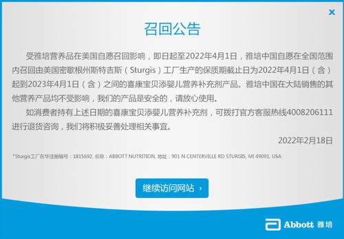 2月18日,雅培中国官网发布召回公告,受雅培营养品美国自愿召回影响,即日起至2022年4月1日,雅培中国自愿在全国范围内召回由美国密歇根州斯特吉斯工厂生产的保质期截止日为2022年4月1日(含)起到2023年4月1日(含)之间的喜康宝贝添婴儿营养补充剂产品。
