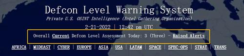 警报声明解释了此次总体等级升至3级的原因。由于乌克兰边境局势和埃塞俄比亚国内持续冲突等事件,目前美国中央司令部、美国欧洲司令部及美国非洲司令部都提升了警报级别,从而总体提升了警报级别。