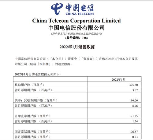 中国电信(00728.HK)公告:2022年1月移动用户数净增307万户,总数达3.7550亿户;其中,5G套餐用户数净增826万户,总数达1.9606亿户。有线宽带用户数当月净增154万户,总数达1.7125亿户。
