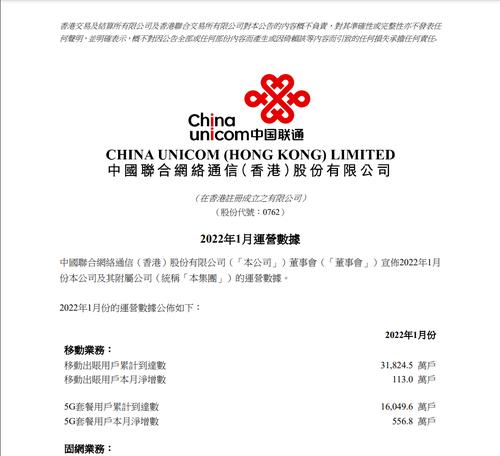 中国联通(00762.HK)公告:2022年1月份集团移动出账用户净增113万户,累计到达3.18亿户;5G套餐用户当月净增556.8万户,累计到达1.6亿户;固网宽带用户当月净增103.6万户,累计到达9608.2万户。
