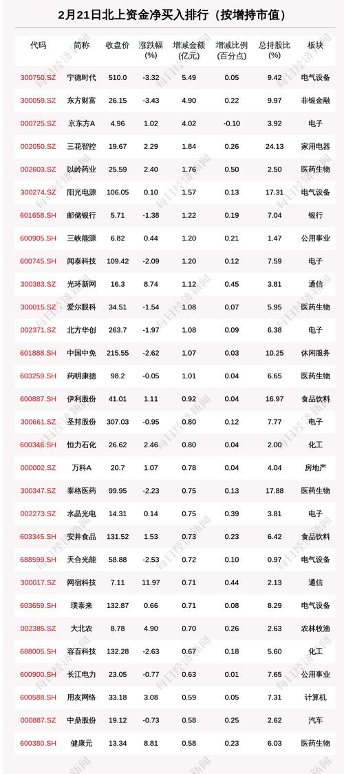 2月21日,按照北向资金增持市值排序,宁德时代(300750.SZ,收盘价:510.0元)增持市值最大,增持市值5.492亿元,环比增加0.55%。其他北上资金增持市值较多的个股还包括东方财富(300059.SZ,收盘价:26.15元)、京东方A(000725.SZ,收盘价:4.96元)、三花智控(002050.SZ,收盘价:19.67元)。