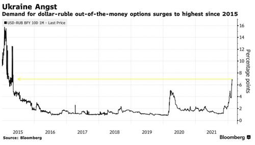 截至莫斯科时间晚上7点21分,卢布下跌2.2%,报每美元79.0500,接近每美元80-82的区间,触达过去两年中四次美元阻力位。俄罗斯货币的25-delta风险逆转率飙升至10.8%,为2015年以来最高。随后,在俄罗斯普京宣布承认顿涅茨克人民共和国和卢甘斯克人民共和国后,卢布兑美元跌幅收窄至1.9%。