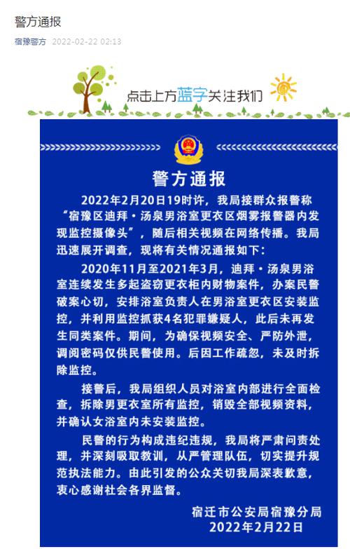据宿豫警方官方微信号2月22日消息,2022年2月20日19时许,我局接群众报警称“宿豫区迪拜·汤泉男浴室更衣区烟雾报警器内发现监控摄像头”,随后相关视频在网络传播。