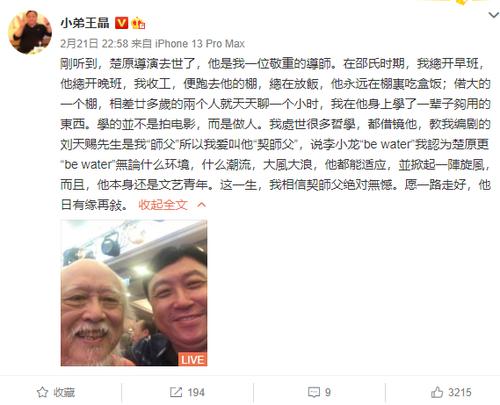 香港导演王晶得悉楚原离世的消息,在微博发文悼念:“楚原导演去世了,他是我一位敬重的导师。”