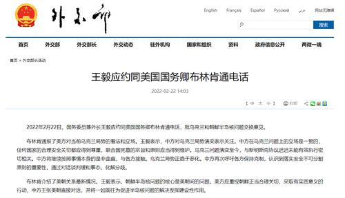 2022年2月22日,国务委员兼外长王毅应约同美国国务卿布林肯通电话,就乌克兰和朝鲜半岛核问题交换意见。