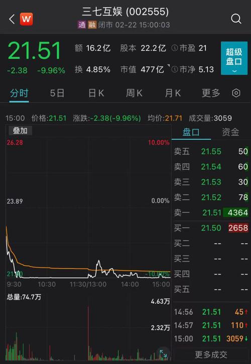 然而业绩预告未能阻挡股价的颓势,截至2月22日收盘,三七互娱报收21.51元/股,下跌9.96%。这已经是三七互娱连续第二天下跌,两日合计跌超16%。