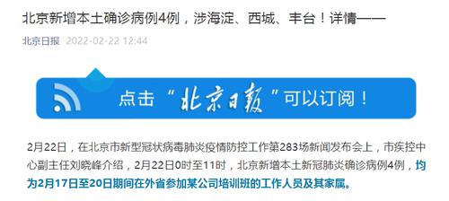 据北京发布微信号,2月22日,在北京市新型冠状病毒肺炎疫情防控工作第283场新闻发布会上,市疾控中心副主任刘晓峰介绍,2月22日0时至11时,北京新增本土新冠肺炎确诊病例4例,均为2月17日至20日期间在外省参加某公司培训班的工作人员及其家属。