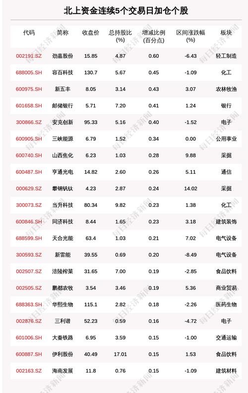 每经AI快讯,2月22日,北上资金连续5个交易日买入32个股。北上资金连续5个交易日加仓个股中,劲嘉股份(002191.SZ,收盘价:15.85元)增持比例增幅最大,5个交易日增持0.60个百分点,其他增持比例较大的个股包括容百科技(688005.SH,收盘价:130.7元)、新五丰(600975.SH,收盘价:8.05元)、邮储银行(601658.SH,收盘价:5.71元),分别增持0.45个百分点、0.43个百分点、0.41个百分点。