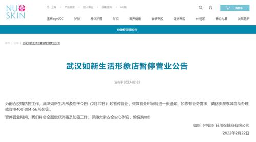 此外,如新(中国)日用保健品有限公司也于2月22日发布公告称:为配合疫情防控工作,武汉如新生活形象店于今日(2月22日)起暂停营业,恢复营业时间待进一步通知。同日另一则公告称,济南体验中心于今日(2月22日)起暂停营业,恢复营业时间待进一步通知。