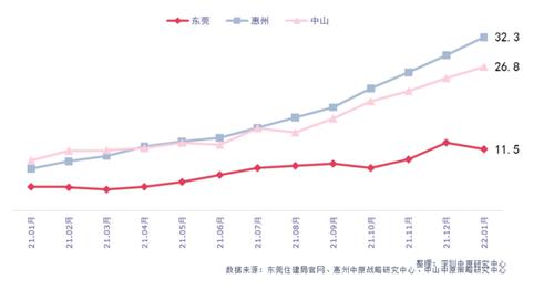 据中原地产数据,截至2022年1月,临深的东莞、惠州、中山房地产去化周期,分别为11.5月、32.3月和26.8月,同比均出现不同程度攀升,其中惠州的去化周期上升最明显,去年1月以来几乎呈45度线直线上升。