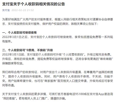 一是2022年3月1日之后,支付宝的个人收款码可继续使用,也可继续享受现有的包括提现免费在内的一系列服务。