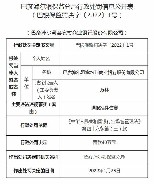 文书号为巴银保监罚决字〔2022〕1号的行政处罚决定书显示,巴彦淖尔河套农村商业银行股份有限公司存在瞒报案件信息的违法违规事实,于2022年1月26日,被巴彦淖尔银保监分局罚款40万元。