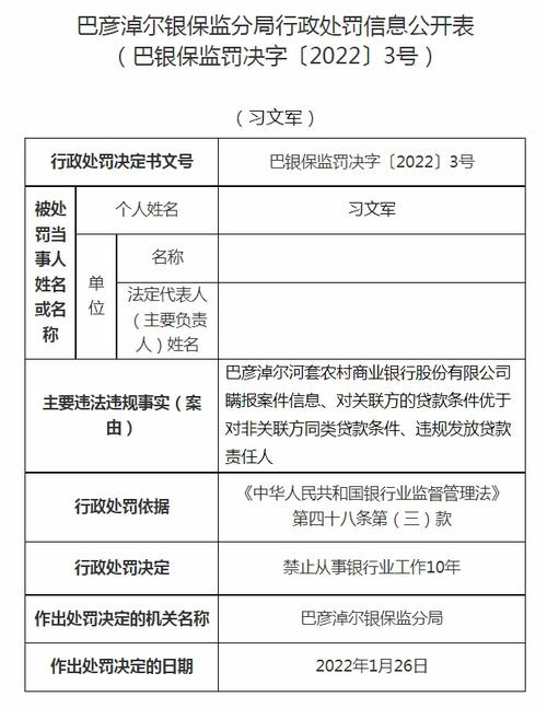 同时,行政处罚决定书(巴银保监罚决字〔2022〕3号)称,作为巴彦淖尔河套农村商业银行股份有限公司瞒报案件信息、对关联方的贷款条件优于对非关联方同类贷款条件、违规发放贷款责任人,巴彦淖尔银保监分局于2022年1月26日对习文军作出行政处罚决定:禁止从事银行业工作10年。