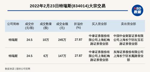 每经讯,2022年2月23日,新三板创新层公司特瑞斯(834014)发生2笔大宗交易,总成交金额为392万元,成交金额最高的一笔成交价24.5元/股,成交数量10万股,成交金额245万元,溢价27.87%。买入营业部是中泰证券股份有限公司上海虹梅路证券营业部,卖出营业部是中国中金财富证券有限公司上海长宁区红宝石路证券营业部。