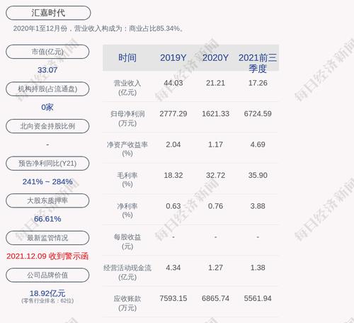 每经AI快讯,汇嘉时代(SH 603101,收盘价:7.03元)2月23日晚间发布公告称,公司于2022年2月23日收到控股股东暨实际控制人潘锦海先生通知,潘锦海先生于2022年2月22日通过大宗交易方式减持公司股份约484万股,占公司总股本的1.03%。
