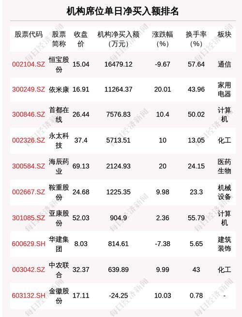 在龙虎榜中,涉及机构专用席位的个股有18只,净买入额前三的是恒宝股份、依米康、首都在线,分别为1.65亿元、1.13亿元、7576.83万元。