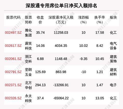 在龙虎榜中,涉及深股通专用席位的个股有6只,雅化集团的深股通专用席位净买入额最大,净买入1.13亿元。