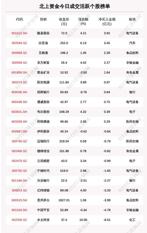 2月23日,北上资金成交活跃个股榜单中,净买入个股共10只,金额最多的是隆基股份(601012.SH,收盘价:72.0元),净买入3.920亿元;净卖出个股共10只,金额最多的是永太科技(002326.SZ,收盘价:37.4元),净卖出6.506亿元。