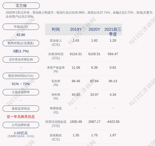2020年1至12月份,宝兰德的营业收入构成为:电信行业占比56.98%,政府占比37.71%,金融占比2.72%,其他(主要为企业用户)占比2.59%。