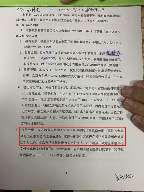 其中,甲方即所谓的“隐名股东”,乙方为马琳杰本人,双方约定“原则上收益分配应在泰坦公司上市后进行,收益分配支付方式应在投资公司收到收益后三个月之内,由乙方以银行转账方式支付甲方”。