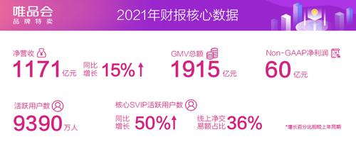 中新经纬2月23日电 23日晚,在线品牌折扣零售商唯品会发布2021年财报数据。2021年,唯品会整体业务实现稳健增长,全年活跃用户数较2020年同比增长12%,达9390万;GMV同比增长16%,达1915亿元(人民币,下同);总订单量同比增长14%,达7.9亿。受益于用户和ARPU的稳步增长,全年收入同比增长15%,达1171亿元;Non-GAAP净利润超过60亿元。