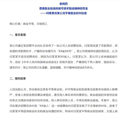 据最高人民法院2月22日消息,某公司通过某招聘平台向社会发布了一批公司人员招聘信息。闫某某投递了求职简历,其投递的求职简历中,户籍所在地填写为“XX省XX市”。某公司查阅其投递的简历后,认为闫某某不适合招聘岗位,原因为闫某某系XX省人。闫某某认为,某公司上述地域歧视行为,违反《中华人民共和国就业促进法》的相关规定,严重侵犯了其人格权,提起诉讼,请求判令:某公司向其口头道歉、登报道歉,支付精神抚慰金6万余元。