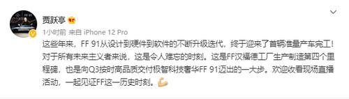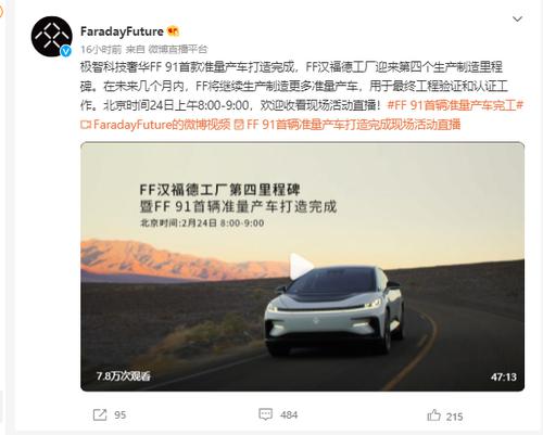2月23日,法拉第未来(下称FF)通过其官方微博发布消息称,FF91首款准量产车已打造完成,将于北京时间2月24日早8:00正式亮相,并通过微博等渠道进行直播。