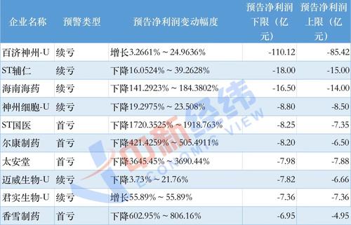 除了百济神州,按照预告净利润下限排序,在预亏损前十的企业还有ST辅仁、海南海药、神州细胞、ST国医、尔康制药、太安堂、君实生物、迈威生物、香雪制药。