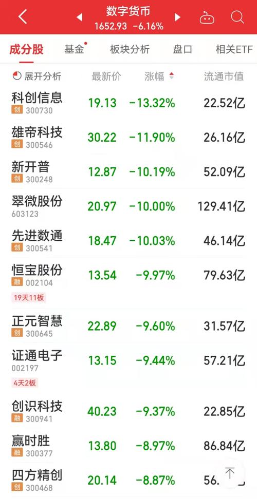 其中,数字货币板块跌幅达到6.16%,科创信息、雄帝科技、新开普、先进数通、翠微股份5支股票下跌逾10%。