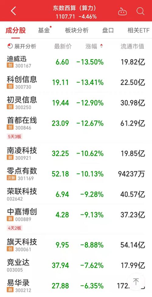 东数西算板块下跌4.46%,迪维迅、科创信息、初灵信息等6支股票下跌逾10%。