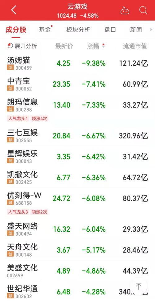 云游戏板块跌幅达4.58%,其中,汤姆猫下跌逾9%,中青宝、朗玛信息下跌逾7%。