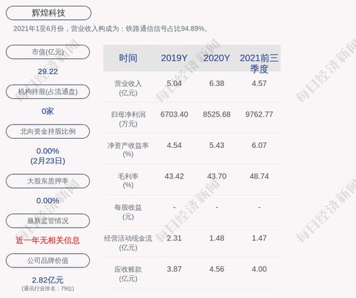 2021年1至6月份,辉煌科技的营业收入构成为:铁路通信信号占比94.89%。