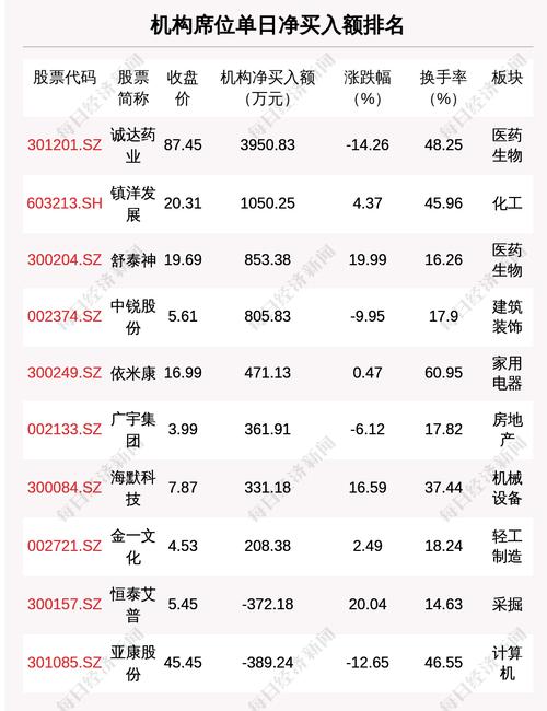 在龙虎榜中,涉及机构专用席位的个股有20只,净买入额前三的是诚达药业、镇洋发展、舒泰神,分别为3950.83万元、1050.25万元、853.38万元。