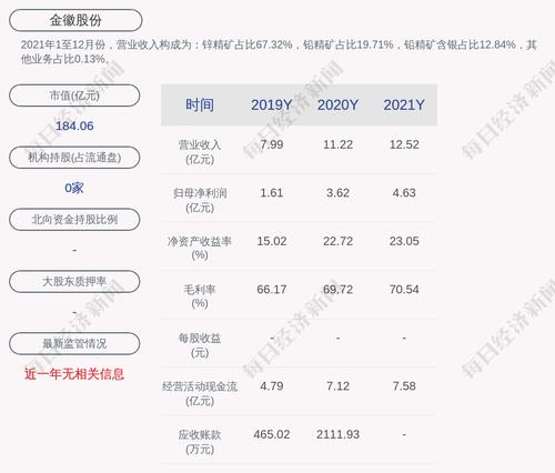 2021年1至12月份,金徽股份的营业收入构成为:锌精矿占比67.32%,铅精矿占比19.71%,铅精矿含银占比12.84%,其他业务占比0.13%。