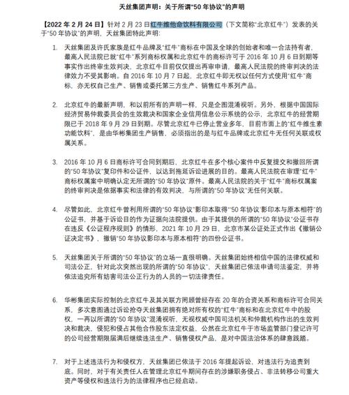 2月24日,天丝集团在官网发布声明,回应此前华彬集团控制的红牛维他命饮料有限公司(以下简称红牛维他命)声明,称针对此次突然出现的“50年协议”,天丝集团已依法申请司法鉴定。23日,红牛维他命表示已经取得“50年协议书原件”,已正式向最高法提交此协议书原件,作为案件再审审理的重要依据。