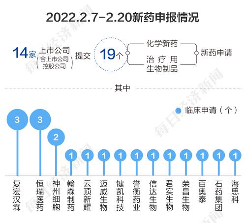 根据药渡数据,2022年2月7日至2022年2月20日,国家药品监督管理局药品审评中心(CDE)共收到14家上市公司(含上市公司控股公司)提交的19个化学新药、治疗用生物制品新药申请。