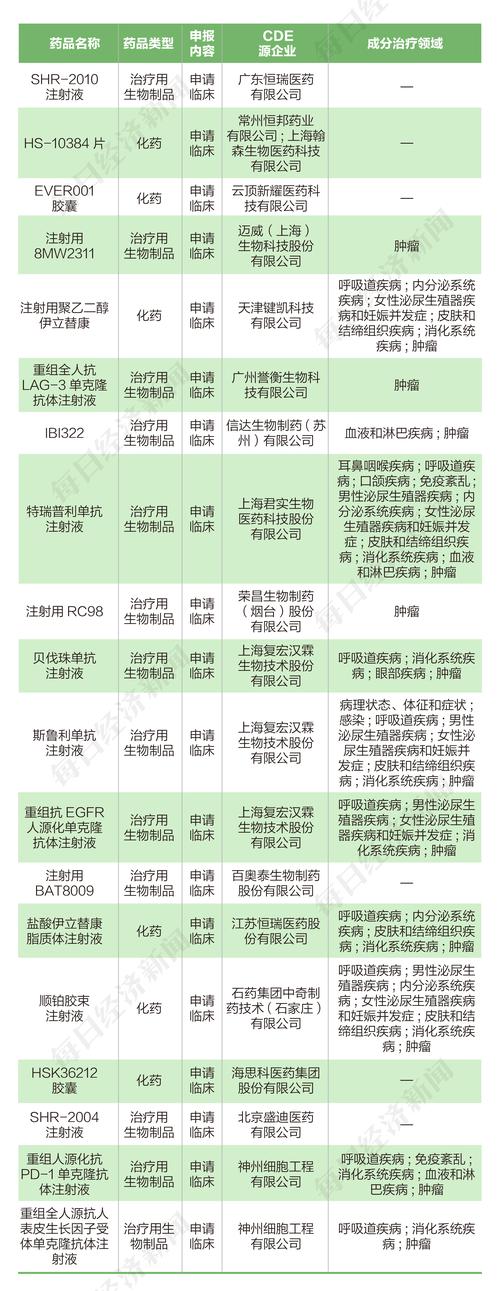 2022年2月7日至2022年2月20日期间,上市公司方面,复宏汉霖(02696.HK)和恒瑞医药(600276.SH)各申报3个临床申请,神州细胞(688520.SH)共申报2个临床申请,翰森制药(03692.HK)、云顶新耀(01952.HK)、迈威生物(688062.SH)、键凯科技(688356.SH)、誉衡药业(002437.SZ)、信达生物(01801.HK)、君实生物(688180.SH)、荣昌生物(09995.HK)、百奥泰(688177.SH)、石药集团(01093.HK)和海思科(002653.SZ)各申报1个临床申请。