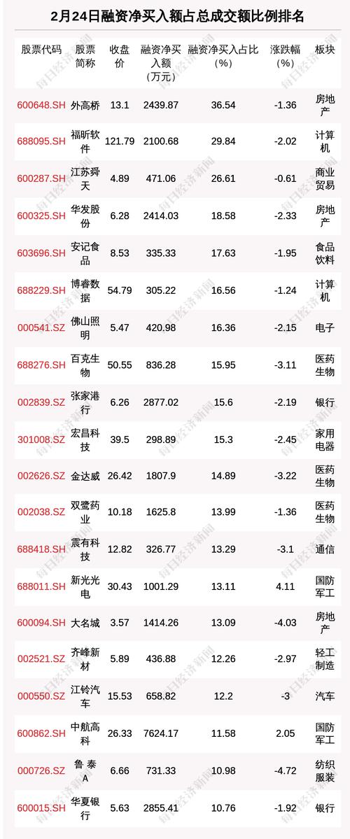 2月24日两市共有960只个股有融资资金净买入。共有30只股票融资净买入额占总成交金额比例超10%,其中外高桥、福昕软件、江苏舜天排名前三,占比分别为36.54%、29.84%、26.61%。