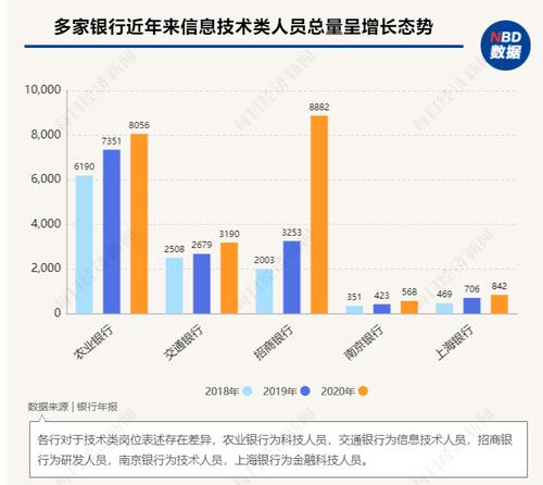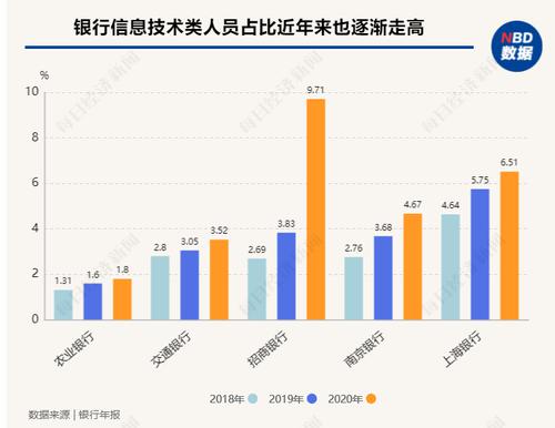 技术人员占比逐年增长的还有交通银行、招商银行和南京银行。数据显示2018-2020年,交通银行信息技术人员(境内行)占比分别为2.8%、3.05%和3.31%;招商银行研发人员数量2年增长了3倍,从2018年的2003人增长至2020年的8882人;南京银行技术人员占比从2018年末的3%增长至2020年末的5%。