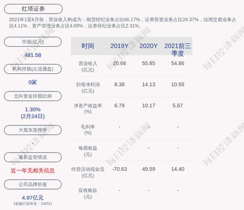 2021年1至6月份,红塔证券的营业收入构成为:期货经纪业务占比66.17%,证券投资业务占比24.37%,信用交易业务占比4.11%,资产管理业务占比4.09%,证券经纪业务占比2.31%。
