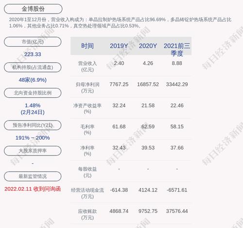 每经AI快讯,金博股份(SH 688598,收盘价:278.47元)2月25日晚间发布年度业绩报告称,2021年营业收入约13.38亿元,同比增加213.72%;归属于上市公司股东的净利润盈利约5.01亿元,同比增加197.25%;基本每股收益盈利约6.26元,同比增加166.07%。