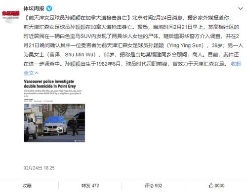 2月24日晚,《体坛周报》官方账号也证实:“前天津女足球员孙颖颖在加拿大遭枪击身亡”。