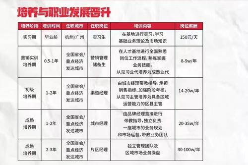 其中,由泸州老窖原四大营销战队之一的博大酒业升级而成的大成浓香公司开启成立后首次校招。招聘信息显示,大成浓香公司目前主要负责头曲、黑盖品牌运作,担负泸州老窖大光瓶战略使命。公司此次招聘的实习期岗位薪酬为150元/天;毕业进入营销实训培养期后,年薪可达8-9万元/年;渠道经理年薪为14-20万元/年,城市经理年薪为20-35万元/年,片区经理年薪为30-100万元/年。按照招聘启事标注的培训时间,能力突出者最短能在5年时间内即可拿到百万年薪。