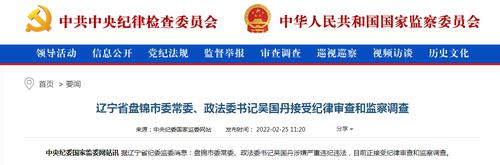 据中央纪委国家监委网站2月25日消息:盘锦市委常委、政法委书记吴国丹涉嫌严重违纪违法,目前正接受纪律审查和监察调查。