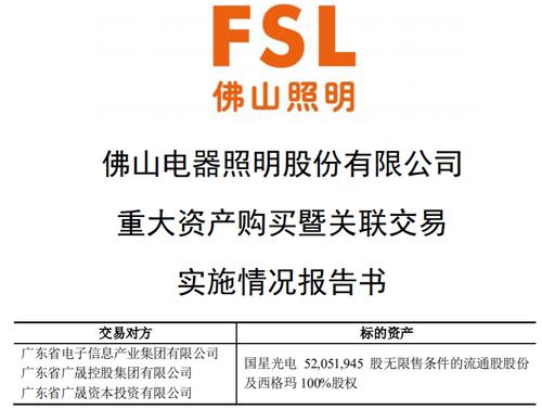 今日(2月25日)晚间,佛山电器照明股份有限公司(000541.SZ;以下简称佛山照明)发布《重大资产购买暨关联交易实施情况报告书》(以下简称《报告书》)。