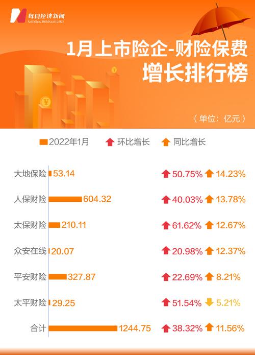 纳入榜单中的6家财产险公司包括平安财险、人保财险、太保财险、太平财险、众安在线、大地保险。2022年1月,6家财险公司合计实现保费收入1244.75亿元,同比增长11.56%。