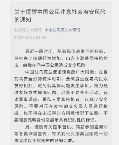 中国驻乌克兰使馆谨提醒广大同胞:在当前乌安全形势特殊时期,要高度重视与乌民众友好相处,避免就具体问题发生争执,努力通过友好方式解决问题。尽量不要外出活动,远离军事设施、军队人员和持枪者,以减少安全风险。不要对正在发生的交火及人员进行拍摄,也不得在未征得对方同意情况下拍照。不要随意亮明身份及展示具有识别性的标识。
