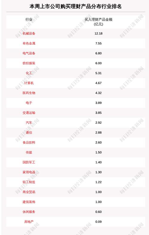从上市公司所属行业上来看,本周买入理财产品金额排名前三的行业分别是机械设备、有色金属、电气设备。